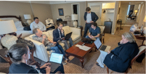 Here’s a photo taken on April 8, 2025, in Guatemala City. In it are, on the bottom left, Laura Williams; sitting on the bed is Ryan Yonk; on the couch are me and, to my left, Caleb Petitt; to Caleb’s left, standing, is Jack Nicastro; seated in the chair nearest Jack is Phil Magness; seated in the chair on the bottom right is Lenore Ealy. This photograph was taken by Brad DeVos. We were drafting – connected by telephone with David Henderson – the Anti-Tariff Declaration.